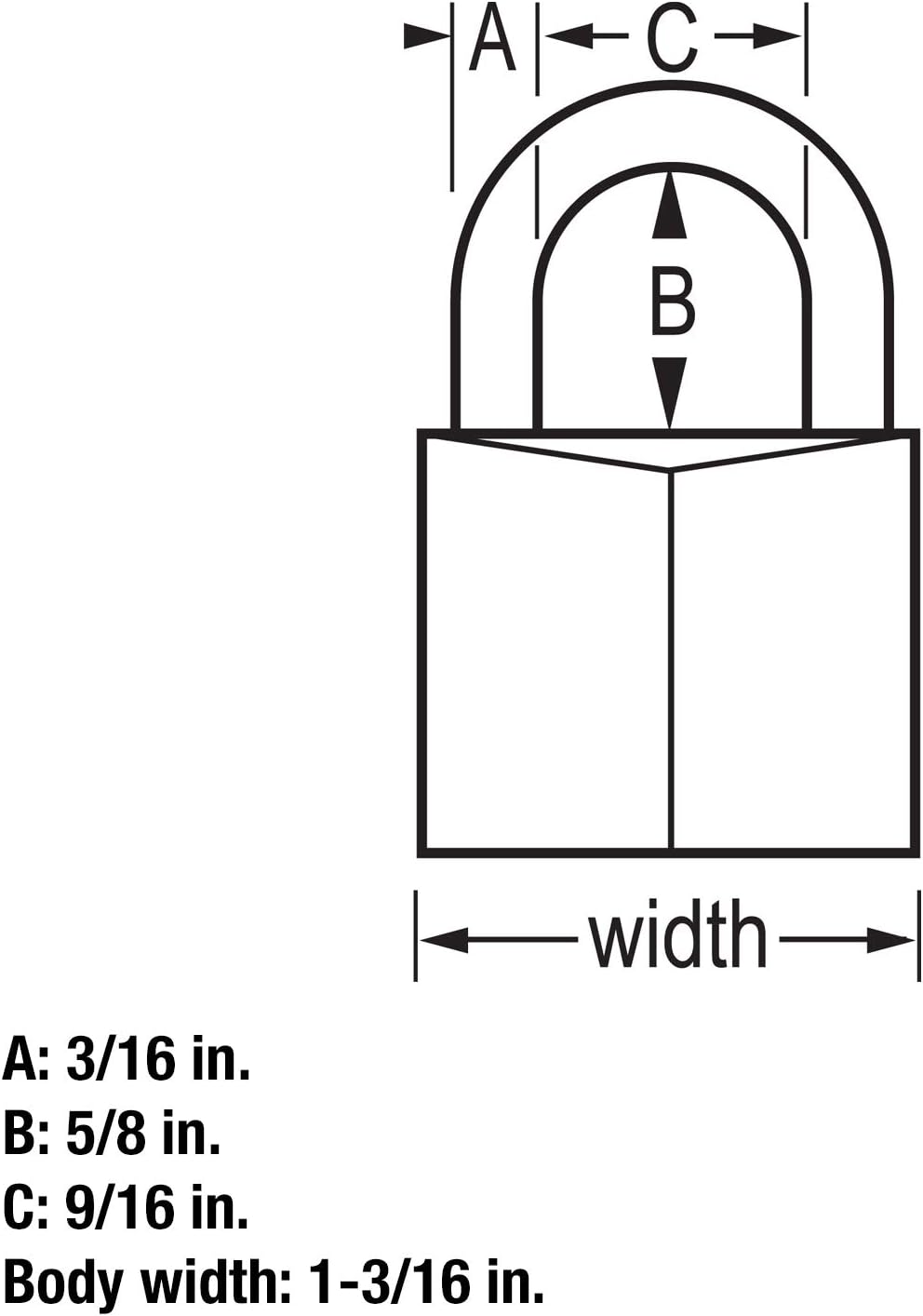 - 1-3/16 in. (30 mm) wide lock body; 3/16 in. (30 mm) diameter shackle with 5/8 in. (16 mm) length, 9/16 in. (14 mm) width