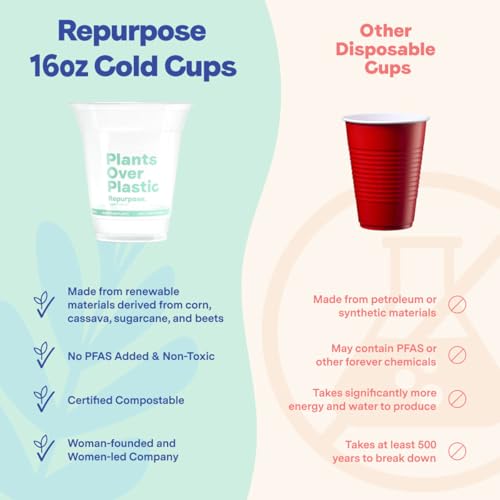 Repurpose 100% compostable Plant Based Clear Cold Cup. These are not traditional cold cups. They are made from plants, not petroleum. They are also certified compostable so they break down in a matter of months, not millennia. Best of all. Our cups are free of all the things you don’t want: bpa, oil-based inks, and petroleum—leaving only what you do want - durable cups at an affordable price.
