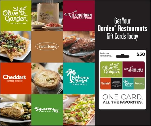 One Card, All the Favorites! From Soup, salad and breadsticks to the signature bone-in Outlaw Ribeye we have 8 distinguished and diverse restaurants on one card. You pick the experience. With over 1,800 restaurants in all 50 states, the Darden Gift Card is One Card with All the Favorites including Olive Garden, LongHorn Steakhouse, Cheddar’s Scratch Kitchen, Yard House, Seasons 52 and Bahama Breeze