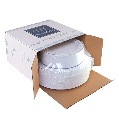 Specification: plastic dinners plates: 10.25" plastic salad plates: 7.5" Weight:9.53lb/pack Color: white with silver rim Material: PS Product Description: Brand:SUPERNAL is new and our goods are also unique which will left deep impression to you. We serch for the signature gold plates, cups and silverware to you. We hope you can have a good dinner time and enjoy the party with your family and friend.The best important is that our goods will left the deep impression to your customer. Recyclable and BPA Free: The silver plastic plates are healthy and safety to any kind of food.They are BPA free. We use the 100% pure PS material to the goods. Best Quality:The disposable party plates are heavy weight with long-lasting strength. They are resistant to breaking, bending and snapping. It can be reused after wash. Perfect for any occasion: This Silver Plastic Dinnerware Set is simply dazzling with a universal appeal that will complement your any party theme.These heavyweight plastic silver plates are designed to withstand even the most temperature intensive foods while maintaining their form and shape. They will last through the entire meal till they are thrown out, or washed and reused for the next meal. Save clean-up time by throwing them out after use, while still enjoying the decorative and elegant accent they add to your event. NOTE & TIPS:Pls don't put them in dishwasher and microwave. If you try to keep and reuse them, please hand wash and dry them after using , Stored in dry place for its durability. BEST CUSTOMER SERVICE TEAM Contact us if you are not satisfied with the plates, we’ll process full refund or send you a replacement without returning or any additional conditions.