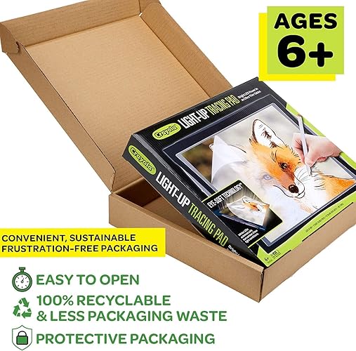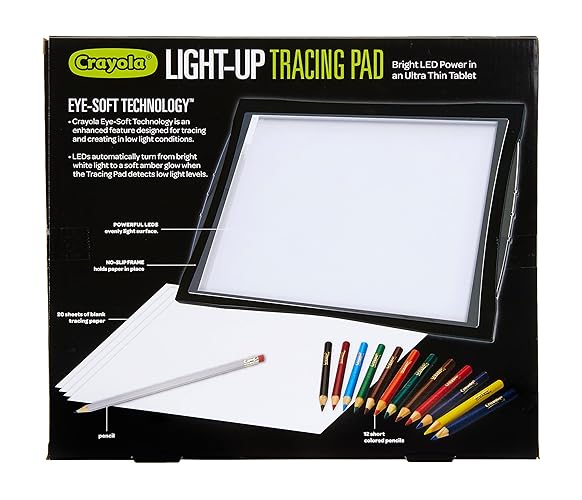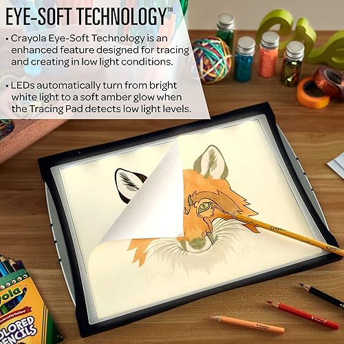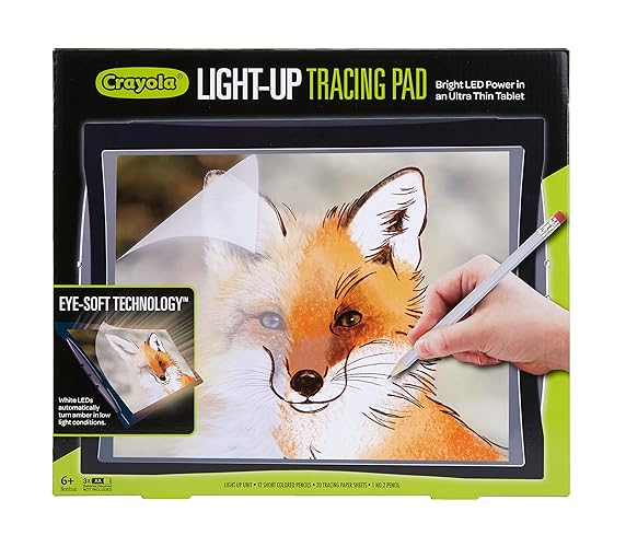Learn to draw like a professional artist with the Crayola Light Up Tracing Pad! This fun art set now features Eye-Soft Technology which automatically adjusts for low-light conditions by producing a soft amber glow and reducing glare from standard white LEDs. The evenly lit surface makes tracing lines easy to see—even in a dark room! Kids can trace photographs, prints, coloring pages, and more! Features a Light Up Tracing Pad with Eye-Soft Technology and White LEDS, 3-Mode Switch (Off/On/Auto), 20 Tracing Paper Sheets, 12 Short Colored Pencils, and 1 Number 2 Pencil (3 AA Batteries Required. Sold Separately). Keep your art in lights by using standard printer paper or Crayola Tracing Paper as a refill option! Makes a great holiday or birthday gift for boys and girls, ages 6 and up.