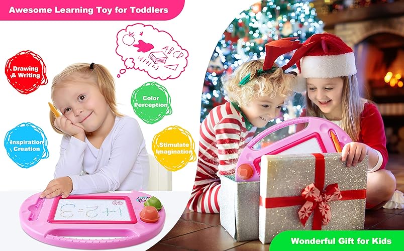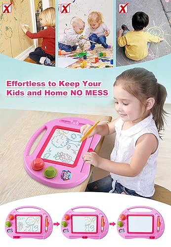 Are you looking for toys for 2 3 years old girls and boys? Great this Magnetic Drawing Board is a worthy option for you! Do you have a little one who absolutely loves pink? Well this is an awesome toy for you! Spark your tiny artist's creativity anywhere! & Mess-free fun is a sure win for parents and kids! Let's use the magnetic drawing board to draw together, learn together, and laugh together! Highlights of the Magnetic Doodle Board Great for use on the floor, table or car Easy-to-grab handle to design on the go Good mid-size toys for age 2-3 toddlers Slider eraser helps remove drawings conveniently Non-toxic, high-quality ABS plastic construction makes it safe for usage for kids Versatile drawing toys - can be used with or without legs, meet all kinds of drawing needs Portable and lightweight with 4 bright colors drawing areas:red, yellow, green and blue Learning & Education drawing toy - wonderful birthdays gifts for girls, Easter gifts for toddlers,Valentines Day Gifts for 2 3 4 year old girls and boys Travel friendly toys, ideal for enjoying mess-free art at home, and also has a carry handle to take drawing fun with you on long journeys or holidays Specifications of the Toddler Toys for Girls & Boys Dimensions (Overall): 11 Inches (H) x 15.5 Inches (W) x 6.5 Inches (D) Suggested Age: 18 Months and Up Educational Focus: Creativity, Fine Motor Skills