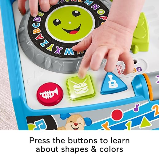 DJ Baby is in the house! The Fisher-Price Laugh & Learn Remix Record Player lets babies put their own "spin" on learning play. This pretend turntable features hands-on activities and fun music to help baby rock out while learning about opposites, colors, numbers, shapes and more! With Smart Stages technology, the learning fun changes as your infant grows with three levels of play, even introducing words in Spanish.