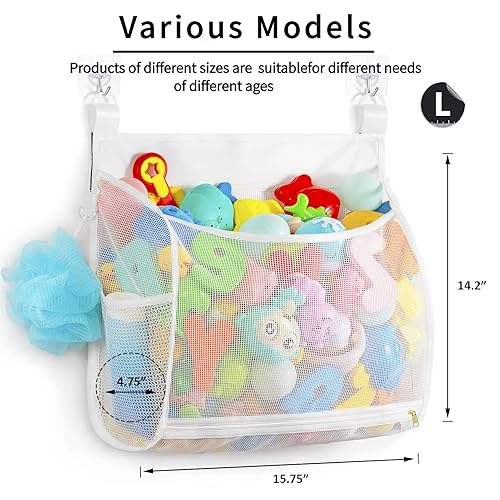 As parents, We want our babies to stay in the bathtub and have fun during bath-time We want the safe toys for our babies We want to keep the bathroom tidy We are worried that the bath toys might get mold For all that, Ligereza Bath Toys Set is what you've been looking for! 1. When you open it, it is filled with toys, and the shape will slowly recover. No matter how many items you put on it, it can be maintained and not deformed and continue to complete its mission 2.PRODUCT INCLUDES: 1 Bath Toy Organizer XL-Large ((15.75L x 14.2W Inch)), 4 free hooks, 2 bath flower hooks, 2 D-shaped buckles, 2 side pockets. 3.AND IF YOU DON’T LOVE IT, YOU DON’T PAY! As a small business, we want to make sure all our customers are totally happy with their products. So if you are less than 100% satisfied, for any reason, we offer a FULL money back refund or replacement – anytime, no question asked 4.RECOMMENDATION: Before using the hook, please wipe the wall first. When tearing off the protective film and sticking it on, make sure that there are no bubbles.