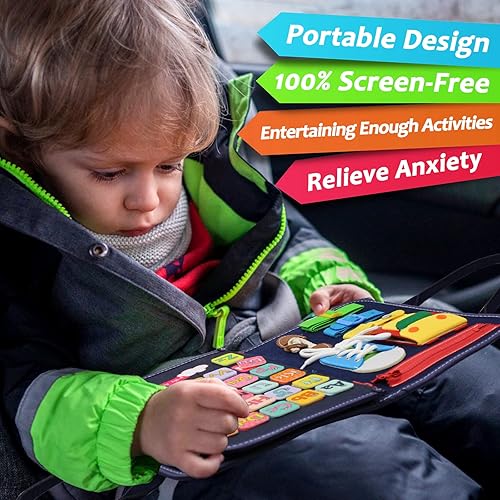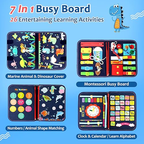 Combining busy book and traditional busy board, we designed this new Montessori busy board with more toddler activities for kids to explore and have fun. Features over 18 learning activities that help kids build dexterity and develop learning skills for preschoolers, including zippers, gears, buttons, shoelaces, clocks, alphabet, animals, numbers, calendar learning games and more
