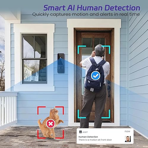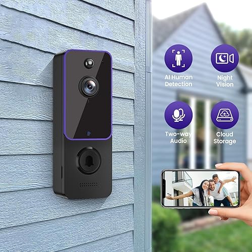 Smart Video Doorbell Included Ring Chime, Security Camera Wireless, Battery Powered, Wide-Angle Lens, 2 Way Audio, Night Vision, Human Detection, for Indoor/Outdoor Surveillance camera doorbell wireless outdoor security door cameras home system video apartment chime wired battery mount bell indoor camaras seguridad smart front camara mini house wifi doorbells powered outside sensor cámara timbre inalámbrico exterior seguridad puerta cámaras casa sistema vídeo apartamento timbre con cable batería monte timbre interior cámaras seguridad inteligente frente cámara mini casa wifi timbres alimentado exterior sensor Robust Cloud Storage Security: Experience AES-128 encrypted cloud storage with optional subscription plans (sold separately) for added convenience. Enjoy a 30-day free trial to explore recording, reviewing, and sharing your videos with ease.All-Weather Resilience: IP65 dustproof and waterproof certification guarantees the video doorbell can endure rain, sun, heat, or snow, providing dependable security all year round.High-Speed 2.4GHz Wi-Fi Compatibility: Exclusively designed for 2.4Ghz Wi-Fi, the doorbell camera ensures fast and stable connectivity for seamless performance (5GHz Wi-Fi not supported).Intelligent AI-Powered Human Detection: Activate the smart AI human detection feature to accurately identify people while disregarding other moving objects, ensuring precise security alerts.Cutting-Edge Night Vision: Equipped with six infrared lights and a smart IR sensor, monitor your home around the clock with clear, high-resolution video, even in low-light conditions.