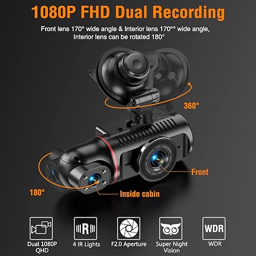 Vlokda Dashcam Front and Inside FHD 1080P - Your Cost-effective ChoiceHigh resolution, equipped with F2.0 large aperture, 4 IR lights, recording 1080P high-definition video in front of and inside the car.2-channel recording, wider viewing angle, 170° front&cabin, and the cabin lens can be rotated 180°, reducing blind spots and effectively providing you with a wider field of view.Built-in G-sensor, loop recording, parking monitor, motion detection mode, etc.NOTE:1、A memory card is included in the packaging. Max Support 64 GB dash cam Card. Class 10, U1 Speed dashcams Card is required. Please format the car camera card before using.Please turn off motion detection function and reduce G-sensor sensitivity when you are driving.2、The mini usb cable in package is for transfering video to your computer, which can not been used as power cord, please use the car charge to power this car recorder camera.3、The car camera has a built-in battery as an internal power source for emergency recording. If you want to keep the camera turned on for 24 hours, you need to power it continuously, just connect it to the Hardwire Kit. ( Need to purchase separately )4、Before installing the camera, please power up the car recorder to test whether it can be used properly, including whether the display of the front and inside cameras is normal.( Please use the car charger to get power from the cigarette lighter.)Vlokda Dual Dash Cam 1080PFull HD recording day & nightVlokda Front and Inside dash camera for cars is equipped with 1080P (FHD) front lens + 1080P (FHD) interior lens resolution, with infrared night vision lens, which can clearly record the surrounding environment no matter day or night, without being affected by light. Equipped with 170°+170° ultra-wide-angle lens to reduce visual blind spots and make your travel more assured.