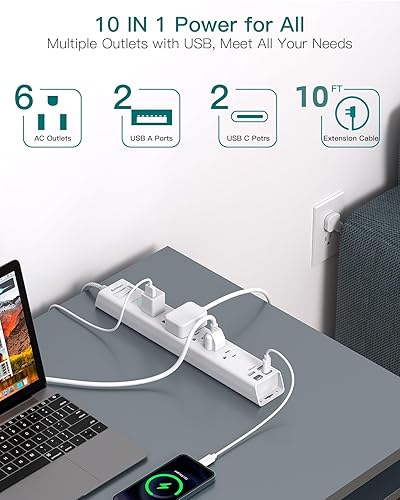 Extension Cord 10 ft - Long Power Strip Surge Protector, 6 AC Outlet 4 USB (2 USB C), Flat Plug, Wall Mount, Multi Plug Outlet Extender Desk Charging Station for Home Office Dorm Room Essentials