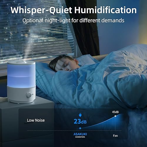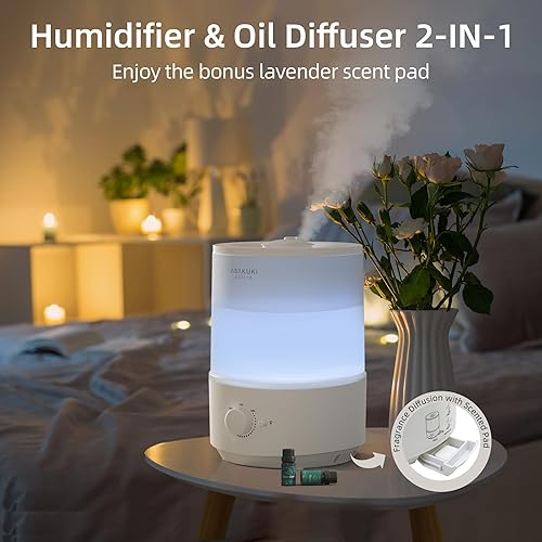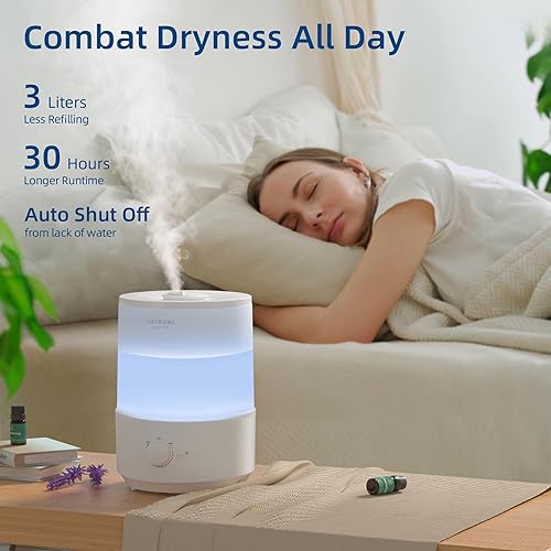ASAKUKI Humidifiers for Bedroom, 3L Top Fill Cool Mist Humidifiers for Baby Nursery & Plants, 3-IN-1 Quiet Air Humidifier, Oil Diffuser & Night Light for Large Room Home, Auto Shut-off, BPA-Free, 30H