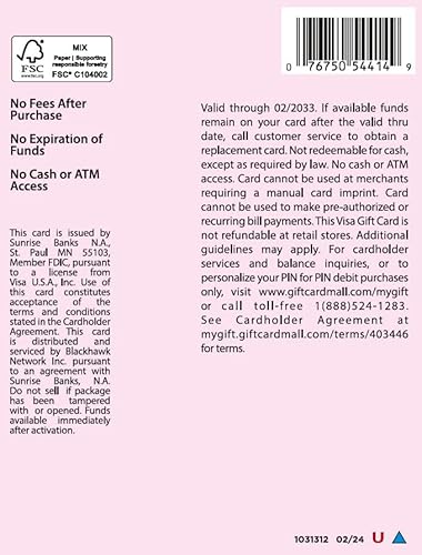 This card is non-reloadable. No expiration of funds. No cash or ATM access. Cards are shipped ready to use. For FAQ’s on how to use your Visa prepaid gift card please visit mygift.giftcardmall.com for more information A one-time $5.95 purchase fee applies at the time of purchase. No fees after purchase (including dormancy, service or other fees). This item is not eligible for refund or return. Available for sale within the United States only (not available to Puerto Rico residents). Additional shipping restrictions apply to Hawaii, Kansas, New Mexico, South Dakota, US Virgin Islands, Vermont, and West Virginia. Do not provide any gift card details (such as the claim code) to someone you do not know or trust. There are a variety of scams in which fraudsters try to trick others into paying with gift cards. We want to make sure our customers are aware of potential scams that may involve asking for payment using gift cards. See "Be Informed" link at the top of the page to learn more.