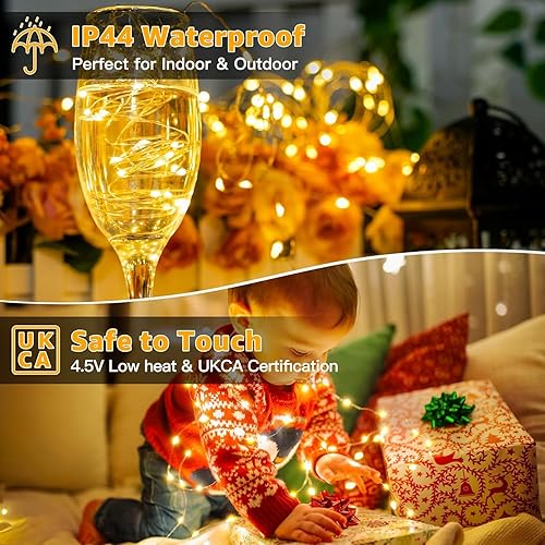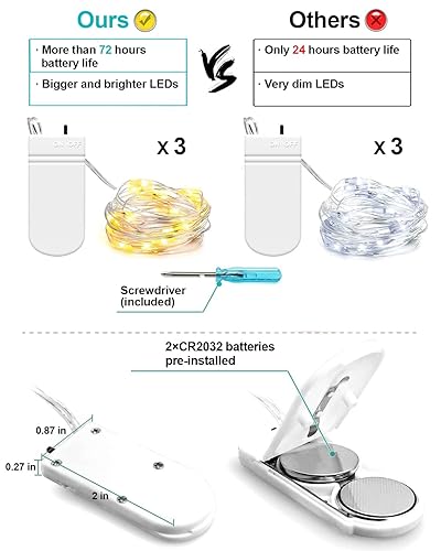 HOBAYS 6 Pack Fairy Lights Battery Operated, 7ft 20 LED Mini String LightsThe small LED fairy lights powered by CR2032 batteries will be more convenient to carry and make your party decoration more convenient. The mini battery box can be more conveniently hidden in the work, so these mini fairy lights are more suitable for birthday parties, Christmas, weddings, bedrooms, backyard and gift decoration. Higher quality standards - The copper wire part is waterproof, weatherproof and windproof, easy to use, very bright, and always provides a lovely and relaxing environment.Flexible copper wire - The fairy string lights is made of a flexible thin copper wire. It can be easily bent and flexibly molded into any shape you want.Safety and energy saving - LED starry lights has low energy consumption. No overheating, safe to touch. No glare, soft and warm light to protect your eyes. SpecificationsLED Color: Warm White & Cool WhtieLED Quantity: 20 LEDsLength between LEDs: 4 inchString Length: 7ftWaterproof: IP65Wire Color: Silver Package6 * LED Fairy Lights1 * Screw driver