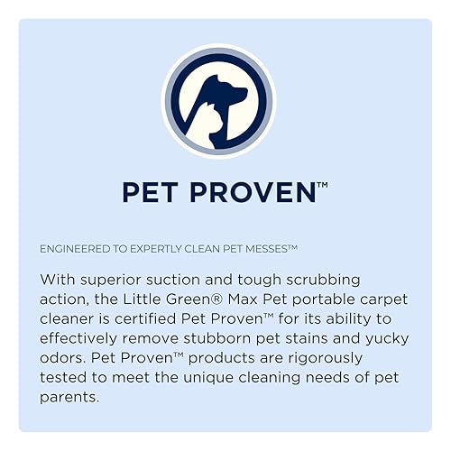 Introducing the BISSELL® Little Green® Max Pet Portable Carpet & Upholstery Deep Cleaner, a cutting-edge machine designed with convenience in mind—especially for pet parents. This innovative cleaner uses a combination of superior suction and scrubbing action to permanently remove tough pet stains on soft surfaces and eliminate odors like pet urine. With a lightweight design, the Little Green® Max Pet is easy to use and store. This machine has a one-touch hose and tool cleaning function to provide a simple "clean-afterthe-clean" experience without having to change out your tool. BISSELL proudly supports BISSELL Pet Foundation® and its mission to help save homeless pets. When you buy a BISSELL® product, you help save pets, too. We’re proud to design products that help make pet messes, odors and pet homelessness disappear. 1Based on ASTM F558 average peak air power through hose with connector covered.