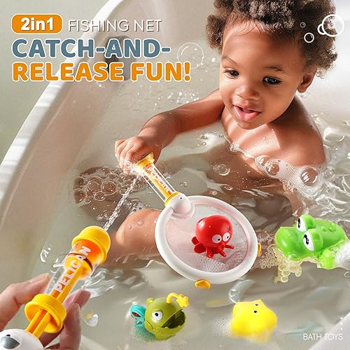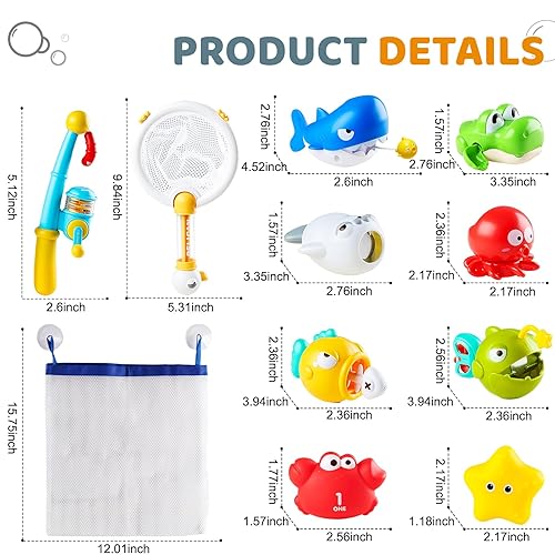 Aprilwolf Bath Toys for Kids, Magnetic Fishing, Net, Squirt |Baby and Toddler Water Toys with Storage Bag, Light Up Star, Wind Up Crocodile, Squishy Crab…Boys Girls Gift, 11pc Set