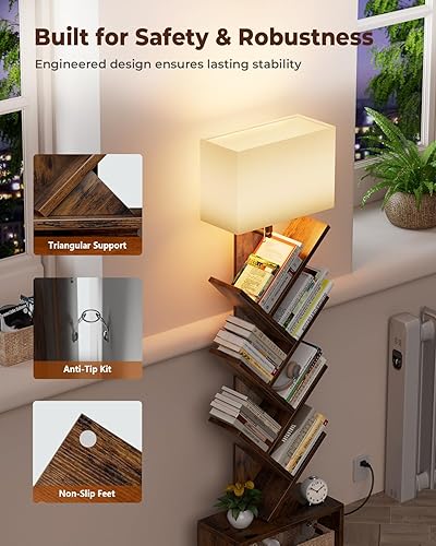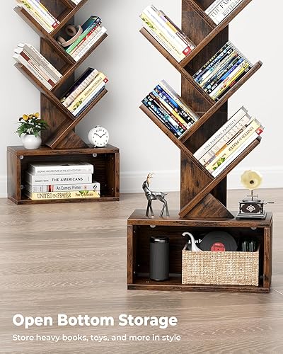 Evermagin 6 Tier Tree Bookshelf with Light, Small Bookcase Tower for Books/CDs/Movies, Tall Floor Standing Book Organizer with Storage Cabinet for Living Room, Bedroom & Home Office, Rustic Brown