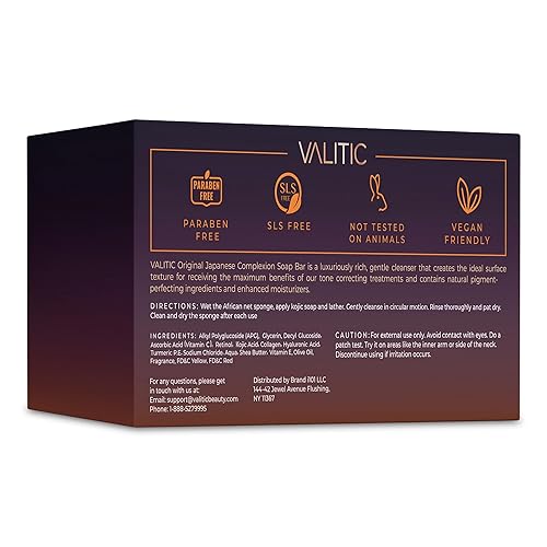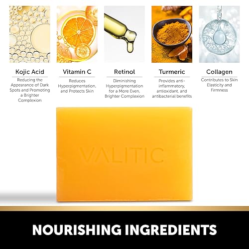 Discover the ultimate solution to dark spots and uneven skin tone with our VALITIC Kojic Acid Dark Spot Remover Soap. Infused with Vitamin C, Retinol, Collagen and Turmeric, this powerful formula hydrates deeply, reducing sun damage and blemishes. Its Original Japanese Complex formulation promotes balanced, glowing skin. Suitable for face, hands, and even sensitive areas like bikini and underarms. Enjoy a complete skincare package with two soap bars and an African Net Sponge for enhanced exfoliation. Free from SLS and Paraben, it's your go-to for daily pampering, leaving skin nourished and revitalized.