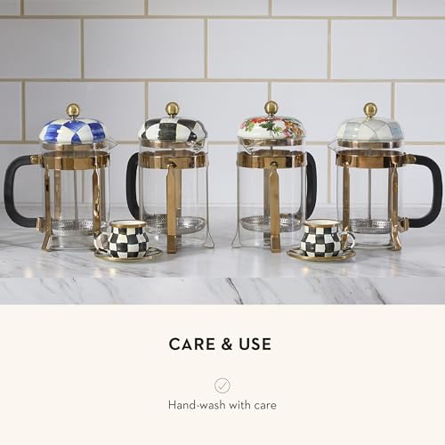 Coffee pots don’t get more stylish and functional than our Coffee French Press. This cute coffee maker features our signature pattern to jazz up the breakfast table or a boring office meeting. It’s made with a steel underbody and has a glass cylinder body to keep your brew toasty. The French-press filter presses down on your ground coffee after you let it steep in hot water, helping bring out even more flavor as you serve with style. The MacKenzie-Childs French coffee-maker press is a statement piece in itself. Place it on a tray or coaster alongside your mugs, sugar bowl, and creamer to create an elegant coffee station. When you add this reusable coffee server to your kitchen, you’ll be ready for everything from early morning brunch to midday caffeine needs. Our coffee press is perfect for those who want to surround themselves with even more MacKenzie-Childs fun. Pair it with our other signature patterned wall-hanging decor, kitchen accessories, or ceramic artwork to create a magnificent MacKenzie-Childs menagerie! You’ll never have to guess what to get for a housewarming gift now that you’re a part of the MacKenzie-Childs family. Our artisan-designed home decor is the perfect gift for any special person in your life. Since 1983, our talented designers and artisans have created beautiful original tableware, furniture, home and garden accessories, and more that add joy and grace to homes great and small throughout the world. Care instructions: Hand-wash with care. Materials: Heavy-gauge hand-glazed steel underbody embellished with a hand-painted lid pattern. Glass cylinder. Pieces may vary due to the handmade nature of each product. Imported.