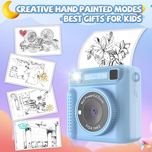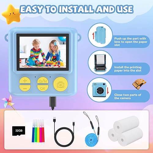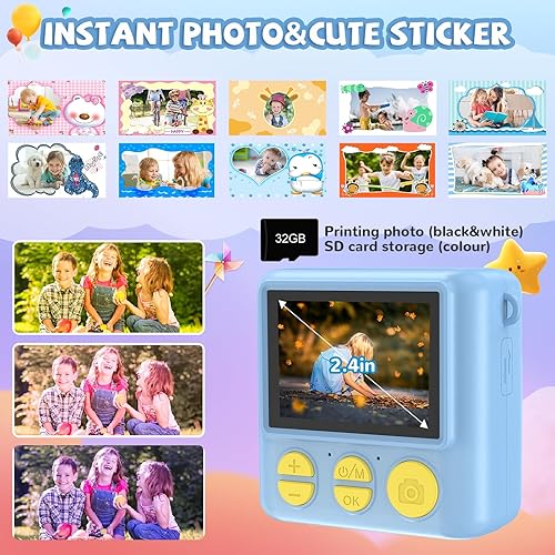 Perfect Gift For Christmas Birthday.JPVERLY Instant Print Camera for Kids.Instant printing function can have a black and white paper photo approximate 1 second after pressing the shutte.The film Camera have 8 kinds of special effects in shots, 9 kinds of sticker and 6 kinds of scene filters .There are 3 volumes of printing paper(One of them is in the camera.), which can print about 240 photos.The package within 5 colorful pens.Children can take interesting pictures and doodle pictures to stimulate imagination.Charge Mode:Instant Print Camera: It is recommended to use a DC-5V 2A DC charger, do not use a fast charging adapterCharging time:about 5 hoursPackage list:Printing camera*1; data cable*1; printing paper*3 rolls (one of which is in the machine); manual*1; lanyard*1; watercolor pen*1 set; customization Blister lining *1; (insert into the machine with 32G memory card *1)