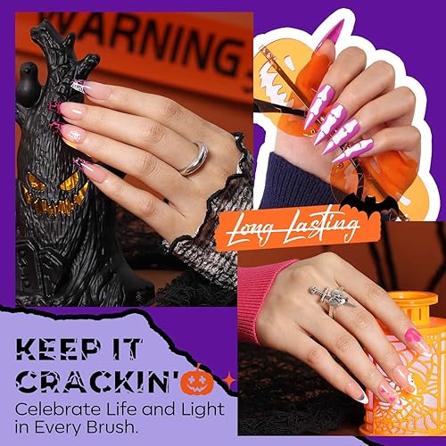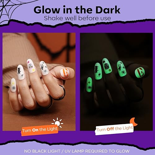 modelones Halloween Nail Polish Set 6 Colors with Spooky Stickers, Glow in the Dark White Crackle Black Purple Orange Hot Pink Quick Dry Nail Art Kit Fall Gift for Women Boo-tiful Nightmare Collection