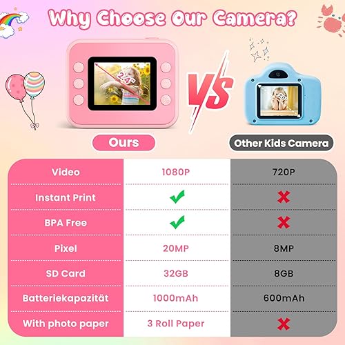 Kids Camera Instant Print, Kids Camera 1080P HD Video Digital Camera, Christmas Birthday Gifts for Girls and Boys, Toddler Toy Camera for 3-12 Years Old