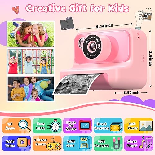 Kids Camera Instant Print, Kids Camera 1080P HD Video Digital Camera, Birthday Gifts Toys for Girls and Boys for 3-12 Years Old, Toddler Camera with Print Paper & 32G Card, Pink